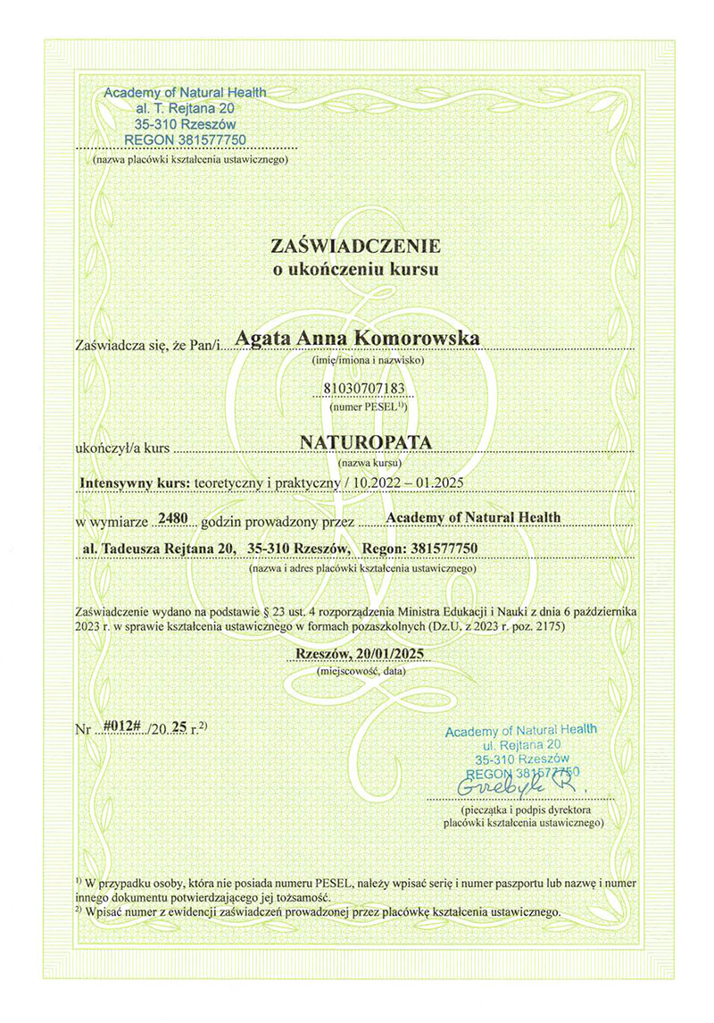 Moje usługi dedykowane są wszystkim, którzy borykają się z różnorodnymi problemami zdrowotnymi – od zaburzeń przewodu pokarmowego, przez alergie, depresję, aż po choroby sercowo-naczyniowe czy problemy hormonalne. Jestem absolwentką Academy of Natural Health Ryszarda Grzebyka oraz posiadam liczne certyfikaty, które potwierdzają moje kompetencje w zakresie biorezonansu i terapii naturalnych.